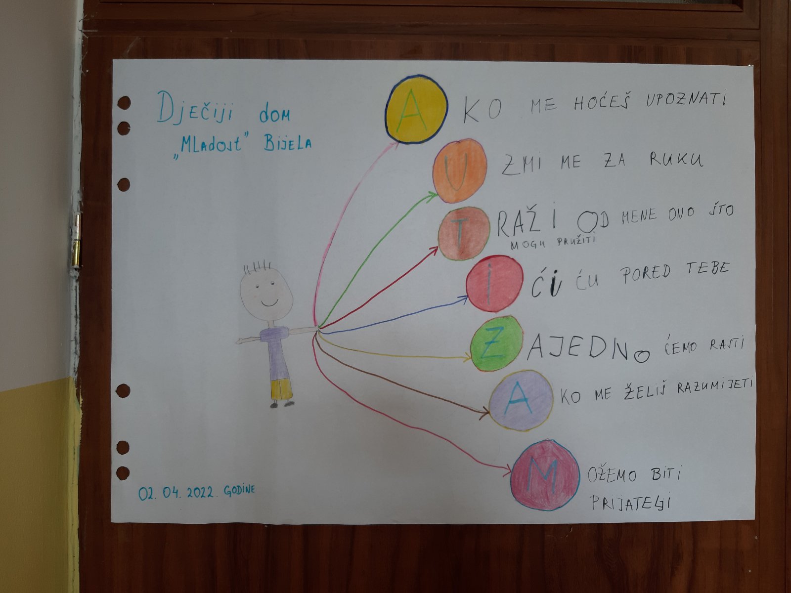 I ove godine naša ustanova je tradicionalno obilježila ovaj značajan datum. U susret drugom aprilu tokom protekle sedmice organizovane su različite aktivnosti. Naša djeca sa rezidencijalnog smještaja kao i korisnici našeg Dnevnog centra za djecu sa smetnjama u razvoju, zajedno sa stručnim radnicima i stručnim saradnicima, učestvovali su u više interaktivnih radionica oslikavajući panoe koji su nosili snažne poruke. Ugostili smo i roditelje korisnika našeg Dnevnog centra i na taj način još jednom potvrdili značaj naše dobre saradnje. Takode, bill smo gosti JU Dnevni centar za djecu sa smetnjama i teškoćama u razvoju Herceg Novi i kroz zajedničko družnje poslali snažnu poruku cjelokupnoj društvenoj zajednici, da razumijevanje, posvećenost i podršku osobama sa autizmom treba unapređivati svakim danom za njihov kvalitetniji život kao i život njihovih porodica.